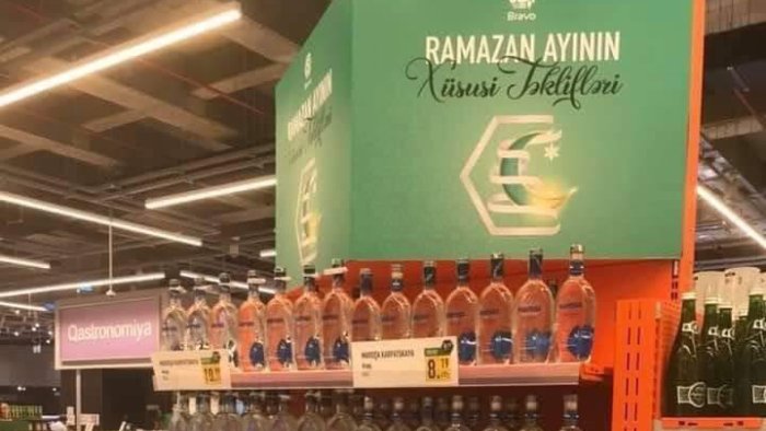 Qeyd edək ki, marketdə endirimdə olan araqların stendi üzərində “Ramazan ayının xüsusi təklifləri” lövhəsi yerləşdirilib.