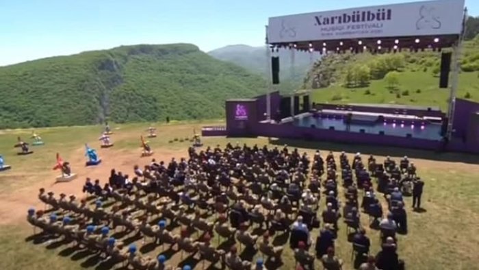 “Uzun fasilədən sonra bu il birinci dəfə keçirilən “Xarıbülbül” musiqi festivalı şəhidlərimizin əziz xatirəsinə həsr olunub. Biz bu günü bizim qəhrəman hərbçilərimizə borcluyuq, Azərbaycan xalqına borcluyuq. Xalq birləşdi, xalq həmrəylik göstərdi, bir yumruq kimi birləşdi və bu Qələbəni Azərbaycan xalqı qazandı. Bu, bizim hamımızın qələbəsidir. Mən xahiş edirəm ki, Vətən müharibəsində həlak olmuş qəhrəman şəhidlərimizin əziz xatirəsini bir dəqiqəlik sükutla yad edək”.
