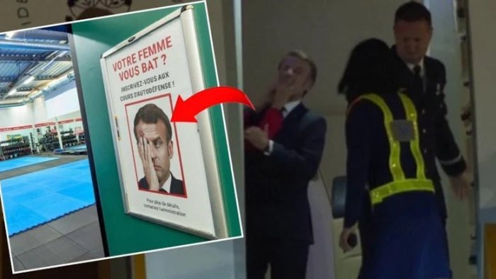 Makronun şəklinin qoyulduğu plakatda deyilir: "Arvadın səni döyürmü? Onda özünümüdafiə dərslərimizə qatıl!"