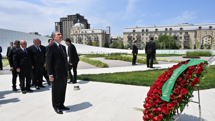 Türkmənistan Xalq Məsləhətinin sədri parkdakı Zəfər abidəsinin önünə əklil qoyub.