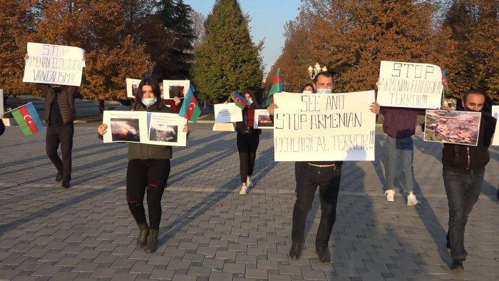 Dünya ictimaiyyətini erməni vandallığına qarşı biganə qalmamağa səsləyən gənclər “Erməni terrorçuluğuna son!”, “Ermənilərin ekoloji terroruna son” kimi şüarların əks olunduğu plakatlar və posterlər nümayiş etdiriblər.