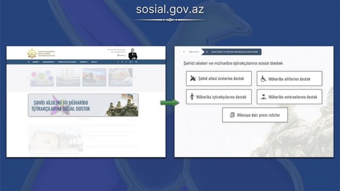 Əmək və Əhalinin Sosial müdafiəsi Nazirliyindən Bizim.Media-ya verilən məlumata görə, bununla əlaqədar məlumatlılıq səviyyəsinin artırılması, xüsusilə həmin kateqoriyalardan olan vətəndaşların daha rahat şəkildə dolğun məlumatlara malik olmaları üçün nazirliyin rəsmi internet saytında (sosial.gov.az) “Şəhid ailələri və müharibə iştirakçılarına sosial dəstək” adlı yeni bölmə yaradılıb.