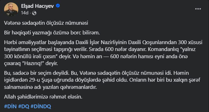 “Bir həqiqəti yazmağı özümə borc bilirəm. Hərbi əməliyyatlar başlayanda Daxili İşlər Nazirliyinin Daxili Qoşunlarından 300 xüsusi təyinatlının seçilməsi tapşırığı verilir. Sırada 600 nəfər dayanır.