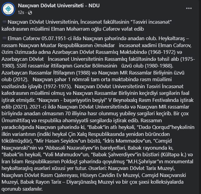 Naxçıvan Muxtar Respublikasının Əməkdar incəsənət xadimi, heykəltəraş-rəssam Elman Cəfərov 74 yaşında vəfat edib.