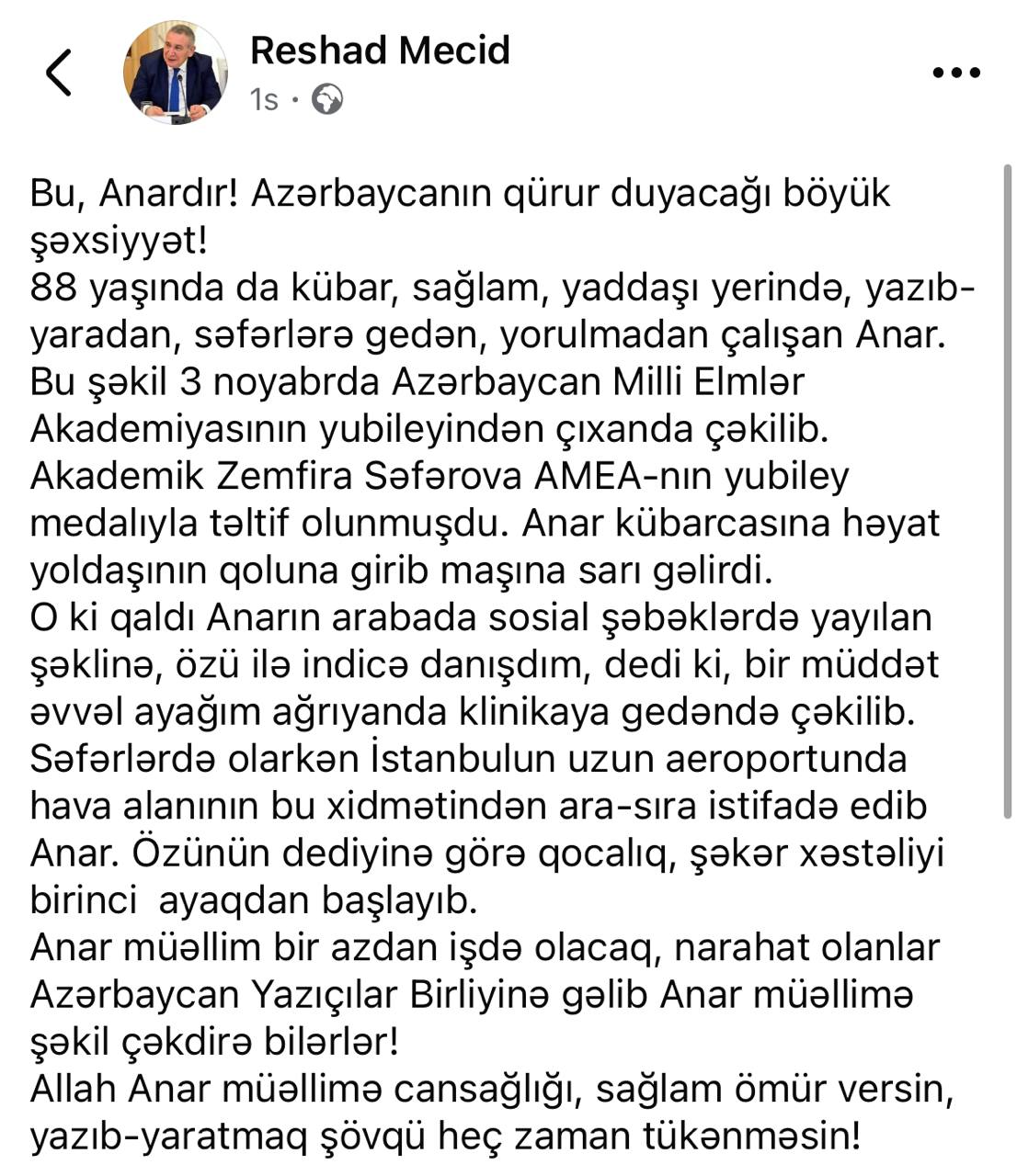 “Bu, Anardır! Azərbaycanın qürur duyacağı böyük şəxsiyyət! 88 yaşında da kübar, sağlam, yaddaşı yerində, yazıb-yaradan, səfərlərə gedən, yorulmadan çalışan Anar. Bu şəkil 3 noyabrda Azərbaycan Milli Elmlər Akademiyasının yubileyindən çıxanda çəkilib. Akademik Zemfira Səfərova AMEA-nın yubiley medalıyla təltif olunmuşdu. Anar kübarcasına həyat yoldaşının qoluna girib maşına sarı gəlirdi”.