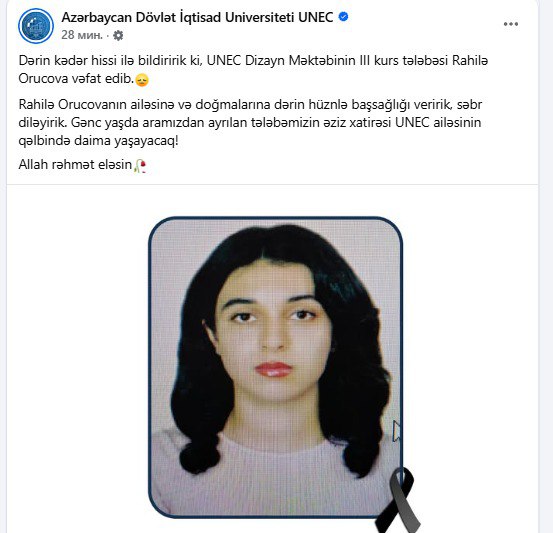 Azərbaycan Dövlət İqtisad Universitetinin (UNEC) Dizayn Məktəbinin III kurs tələbəsi Rahilə Orucova vəfat edib.