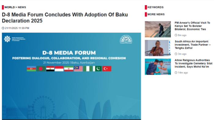Malayziya mediası, xüsusən də ölkənin rəsmi xəbər agentliyi Bernama Bakıda keçirilən D-8 Media Forumunu diqqətdə saxlayıb.