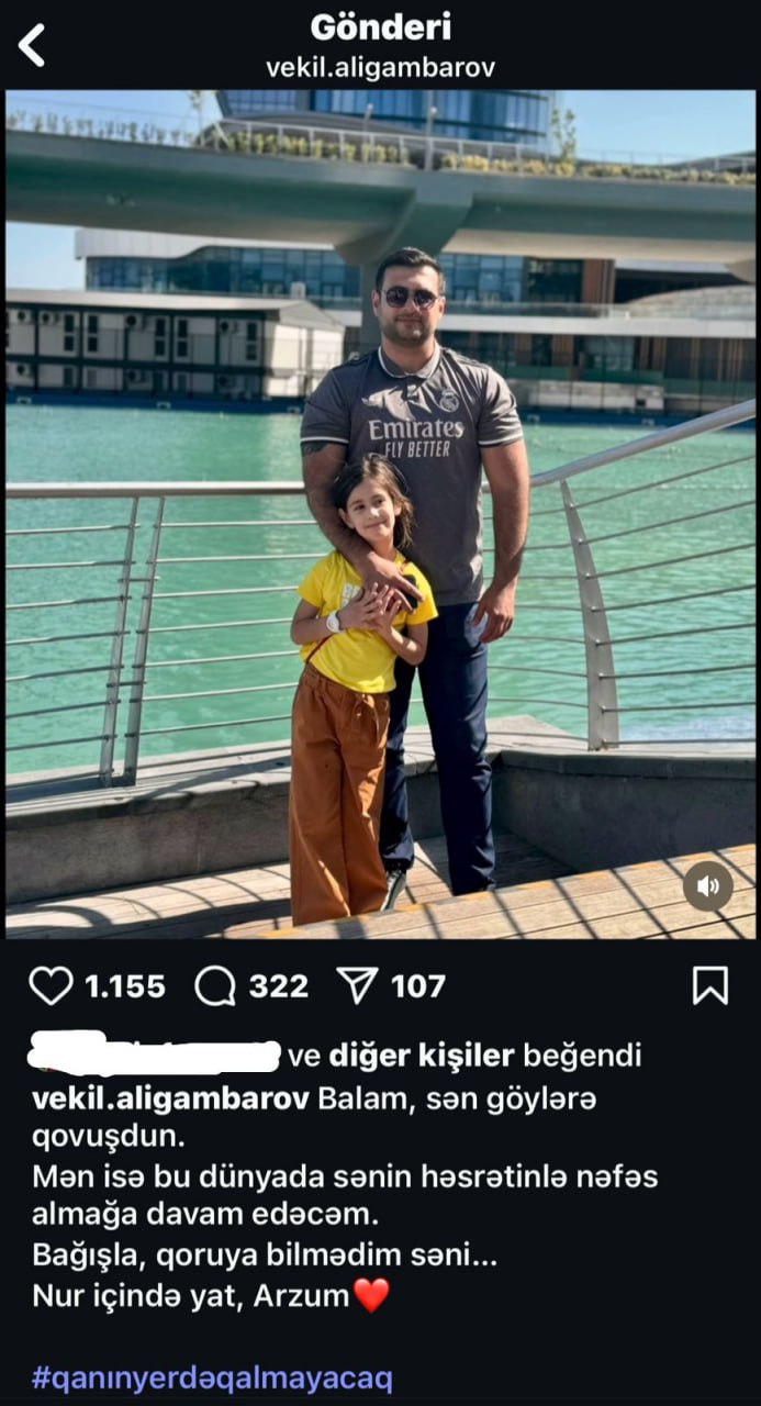 “Balam, sən göylərə qovuşdun. Mən isə bu dünyada sənin həsrətinlə nəfəs almağa davam edəcəm. Bağışla, qoruya bilmədim səni… Nur içində yat, Arzum”.