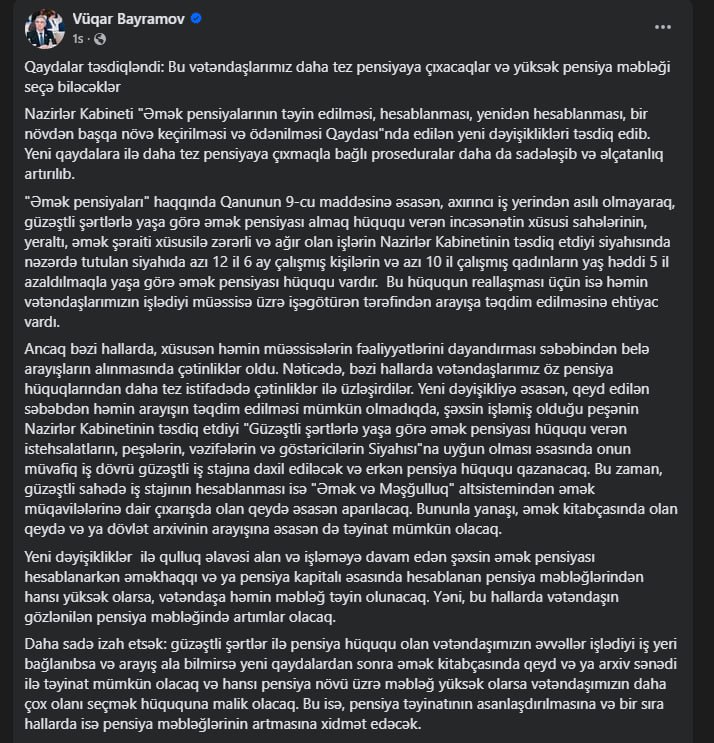 “Nazirlər Kabineti "Əmək pensiyalarının təyin edilməsi, hesablanması, yenidən hesablanması, bir növdən başqa növə keçirilməsi və ödənilməsi Qaydası"nda edilən yeni dəyişiklikləri təsdiq edib. Yeni qaydalara ilə daha tez pensiyaya çıxmaqla bağlı proseduralar daha da sadələşib və əlçatanlıq artırılıb”.