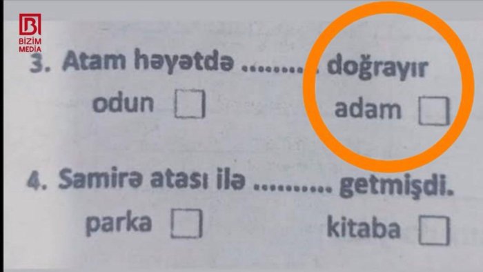 3-cü sinif şagirdlərinə verilən KSQ (Kiçik Summativ Qiymətləndirmə) imtahanındakı dərs vəsaitindən yayılan sual ciddi müzakirələrə səbəb olub. Sualda “Atam həyətdə ........ doğrayır” cümləsi təqdim edilib və tapşırııq olaraq nöqtələrin yerinə cavab variantları kimi “odun” və “adam” ifadələri göstərilib.