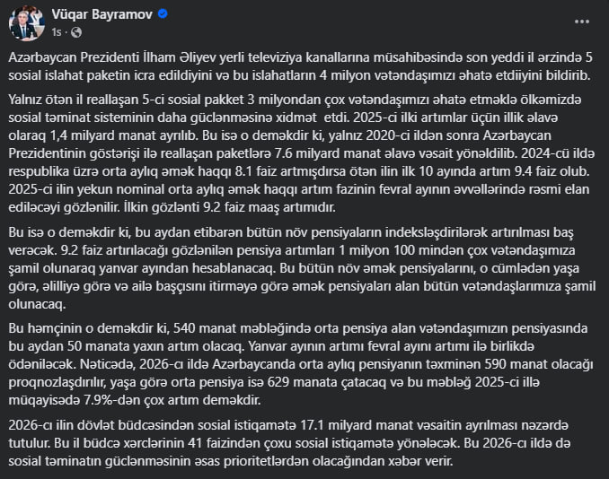 Bu həmçinin o deməkdir ki, 540 manat məbləğində orta pensiya alan vətəndaşımızın pensiyasında bu aydan 50 manata yaxın artım olacaq. Yanvar ayının artımı fevral ayını artımı ilə birlikdə ödəniləcək. Nəticədə, 2026-cı ildə Azərbaycanda orta aylıq pensiyanın təxminən 590 manat olacağı proqnozlaşdırılır, yaşa görə orta pensiya isə 629 manata çatacaq və bu məbləğ 2025-ci illə müqayisədə 7.9%-dən çox artım deməkdir".