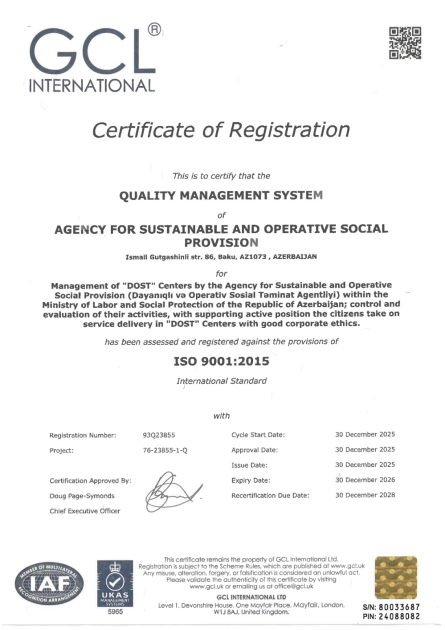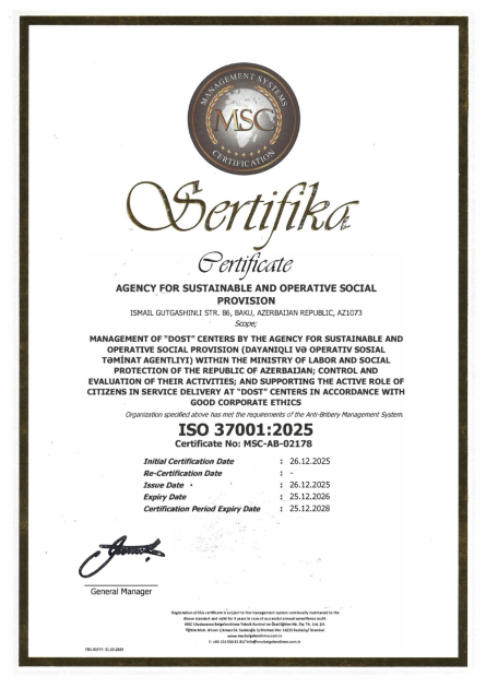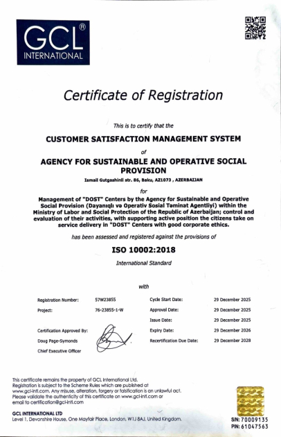 ISO sertifikatları 2028-ci ilin sonunadək etibarlı hesab edilir. Həmin standartların tətbiqi DOST Agentliyi və “DOST” mərkəzlərinin işini daha da yaxşılaşdırmağa, xidmət keyfiyyətini yüksəltməyə imkan verəcək.