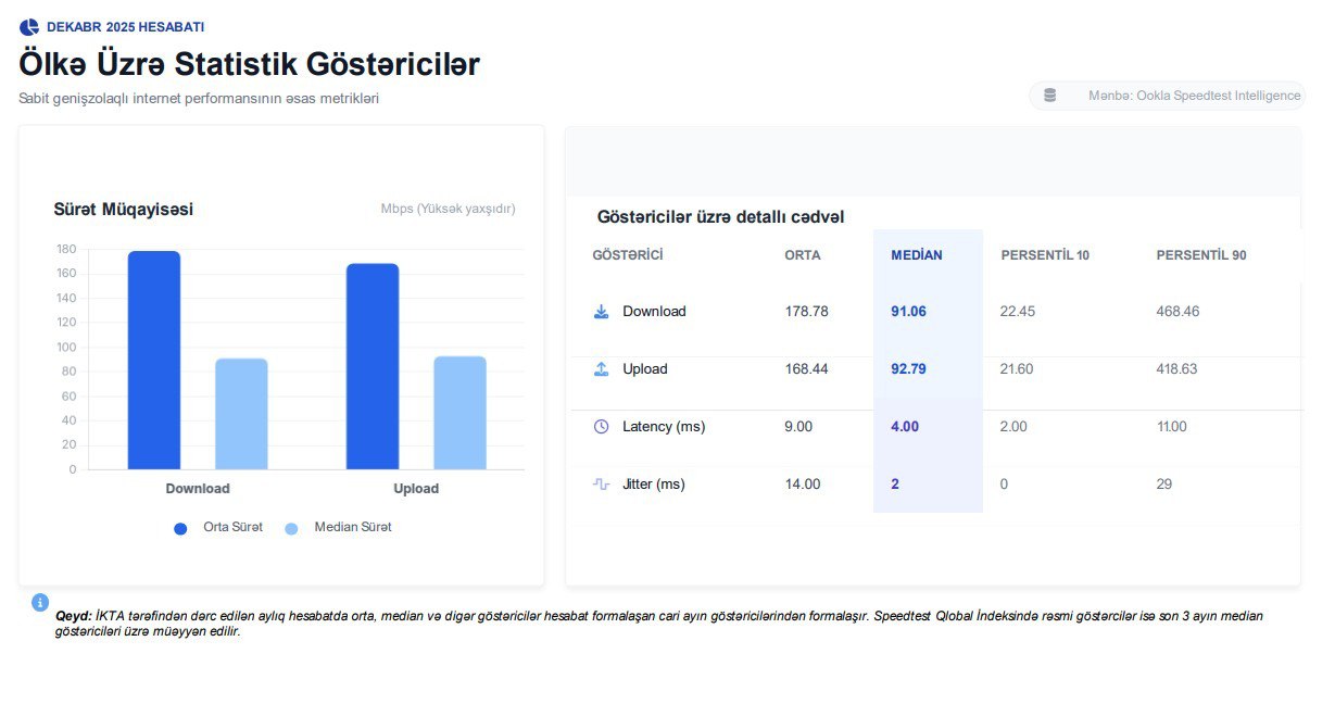 Bizim.Media xəbər verir ki, İKTA 2025-ci ilin Dekabr ayı üçün Azərbaycan üzrə Sabit Genişzolaqlı İnternet Xidmәtlәri üzrә Tәhlil (“Speedtest Intelligence” məlumatları əsasında) Agentliyin rəsmi internet səhifəsində yerləşdirilib.