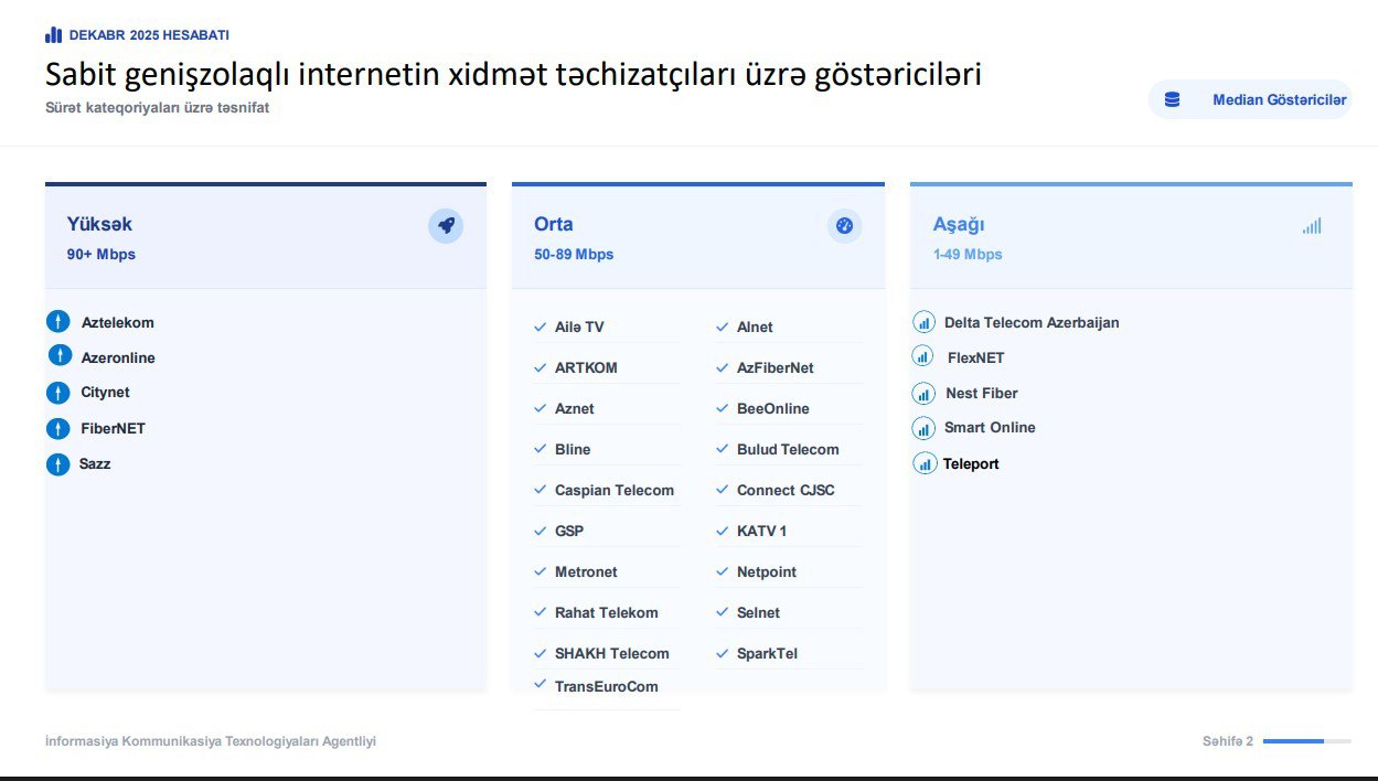 Azərbaycanın telekommunikasiya və poçt xidmətləri üzrə tənzimləyici qurumu İnformasiya Kommunikasiya Texnologiyaları Agentliyi (İKTA) qlobal internet performans qiymətləndirici platforması olan “Ookla”nın metodologiyası əsasında sabit genişzolaqlı internet üzrə provayderlərin 2025-ci ilin dekabr ayı üzrə internet sürət göstəricilərini dərc edib.