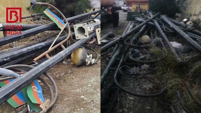 Yerə atılmış dəmir dayaqların altında və kənar hissələrində bir neçə Dövlət bayrağı görünüb.