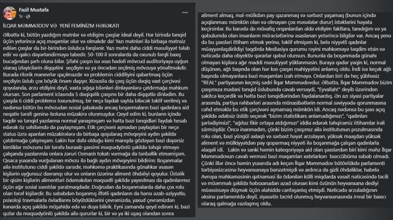 “Rəqəm draması uydurmaq Fazil Mustafanın nəyinə gərək idi? Heç. Ailə quran qadınların məqsədi haqqında qalmaqallı fikrinin guya rəqəmə söykəndiyini göstərmək istəyib. Eyni çıxışda deyib ki, qadınlar aliment almaqdan ötrü ailə qurub tezliklə boşanır”.