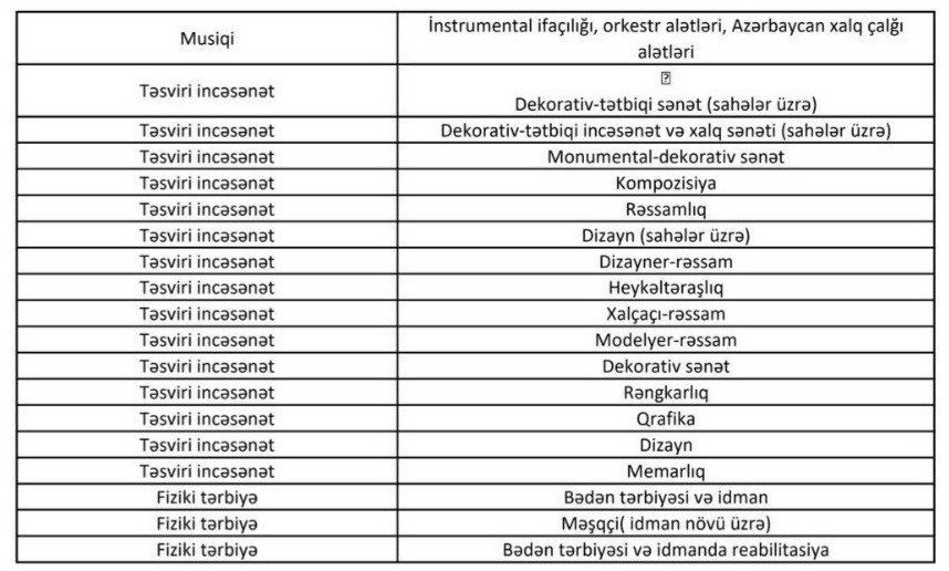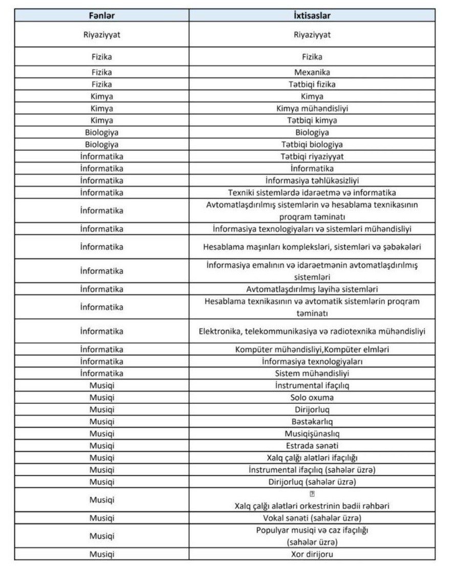 Bildirilib ki, siyahıda qeyd olunan qeyri-pedaqoji ixtisaslara sahib şəxslər müəllimlərin işə qəbulu üzrə müsabiqədə iştirak edə bilərlər. Müsabiqədə iştirakı nəzərdə tutulan pedaqoji təhsili olmayan ali təhsilli mütəxəssislər işə qəbul olunduqdan sonra müvafiq təlim kurslarına cəlb olunacaq.