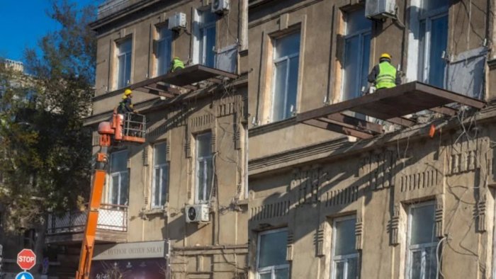 Xüsusi texnika vasitəsilə binanın yuxarı hissəsində artırma işləri aparılır. Bunun üçün əraziyə avtokran tipli qaldırıcı qurğu gətirilib.
