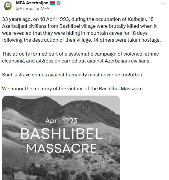 "33 il əvvəl, 18 aprel 1993-cü ildə Kəlbəcərin işğalı zamanı Başlıbel kəndindən olan 18 azərbaycanlı mülki şəxs kəndləri dağıdıldıqdan sonra 18 gün dağ mağaralarında gizləndikləri aşkar edilərək qətlə yetirildi. Daha 14 nəfər isə girov götürüldü. Bu vəhşilik azərbaycanlı mülki əhaliyə qarşı həyata keçirilən sistemli zorakılıq, etnik təmizləmə və təcavüz siyasətinin tərkib hissəsi idi. Belə ağır insanlıq əleyhinə cinayətlər heç vaxt unudulmamalıdır. Biz Başlıbel qətliamı qurbanlarının xatirəsini ehtiramla yad edirik", - paylaşımda qeyd olunub.