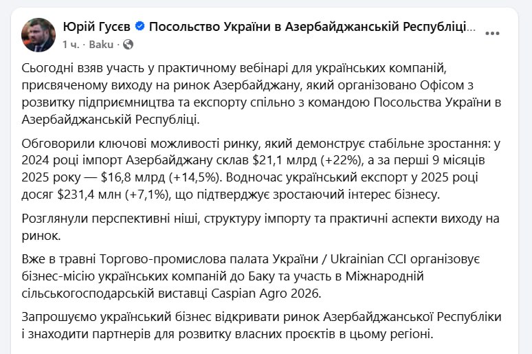Bizim.Media xəbər verir ki, bu barədə Ukraynanın Azərbaycandakı səfiri Yuri Qusev Facebook hesabında ukraynalı şirkətlər üçün keçirilən vebinardan sonra məlumat yayıb.