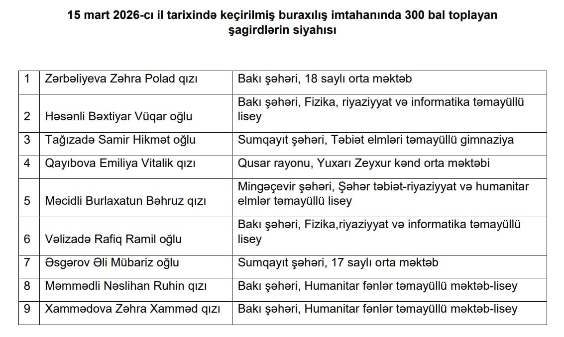 Tam (11 illik) orta təhsil səviyyəsi üzrə 15 mart 2026-cı il tarixində keçirilmiş buraxılış imtahanının nəticələri elan olunub.