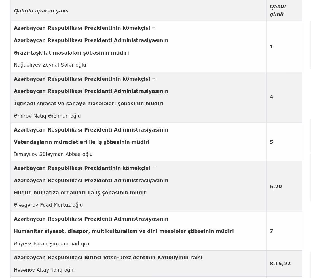 Azərbaycan Prezidenti Administrasiyasının Vətəndaş Qəbulu Mərkəzində 2026-cı ilin may ayında vətəndaşların qəbulu cədvəli açıqlanıb.