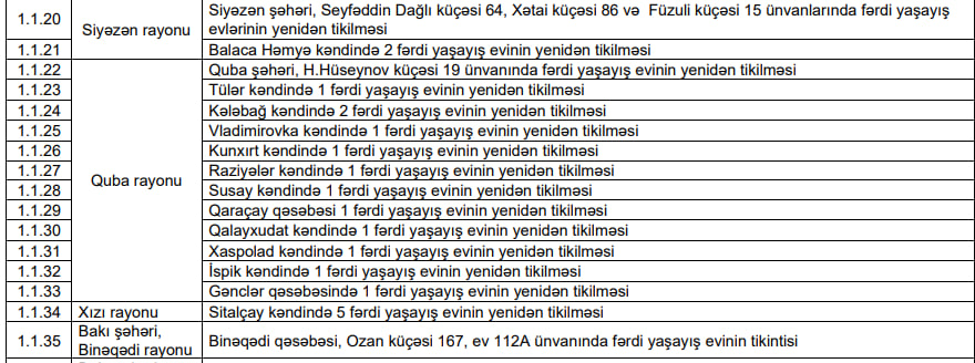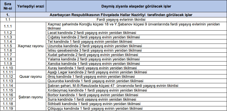 Xaçmaz, Qusar, Şabran, Siyəzən, Quba, Xızı, o cümlədən Bakının Binəqədi rayonunda sel və leysan yağışları nəticəsində zərər görən bir sıra evlər yenidən inşa olunacaq.