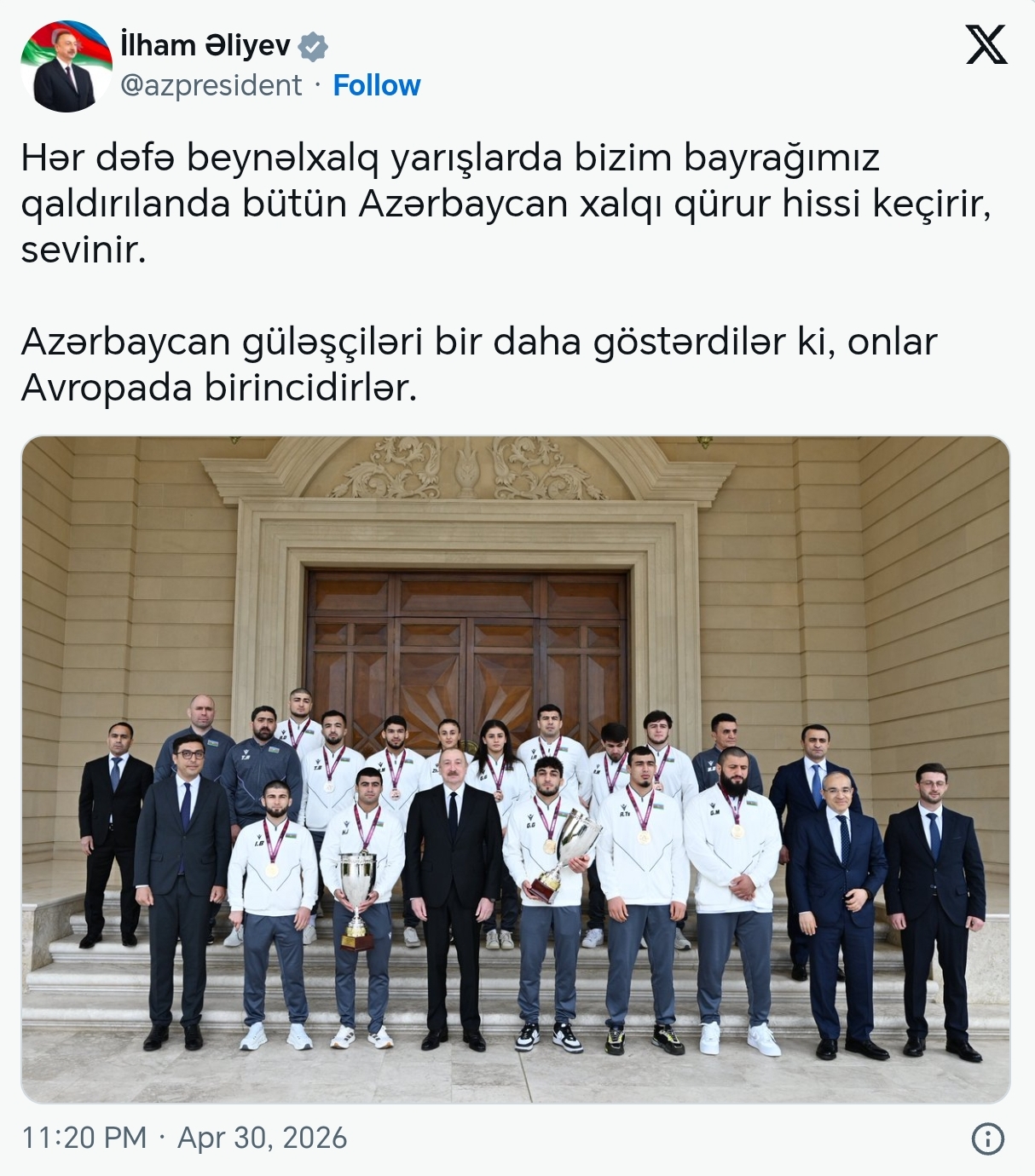 Bizim.Media xəbər verir ki, bu fikir Azərbaycan Prezidenti İlham Əliyevin "X" sosial şəbəkə hesabında yer alıb.