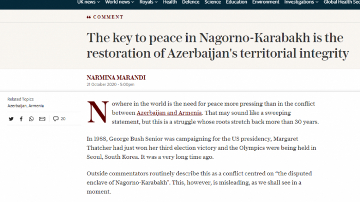 Böyük Britaniyanın “The Telegraph” qəzetində “Dağlıq Qarabağda sülhün təmin olunmasının əsas yolu Azərbaycanın ərazi bütövlüyünün bərpa edilməsidir” başlıqlı məqalə dərc olunub.