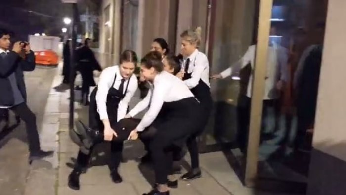Videoda restoranın 4 qadın əməkdaşı restorana daxil olan qızı qucaqlarında bayıra çıxarırlar.