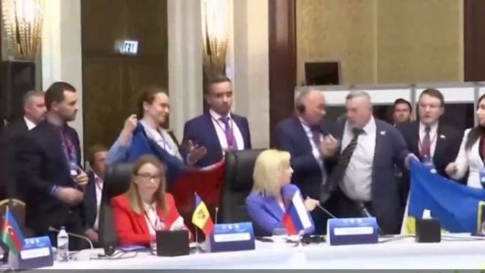 Qeyd edilib ki, Rusiya Dövlət Dumasının “Vahid Rusiya”dan olan deputatı Olqa Timofeyeva “Müqəddəs Georgi lenti” asıb. Ukrayna rəsmiləri onun çıxışını pozmağa çalışıblar və onun arxasında bayraqlar açıblar. Rusiya nümayəndə heyətinin üzvləri isə ukraynalıların hərəkətlərinin qarşısını almağa çalışıblar.