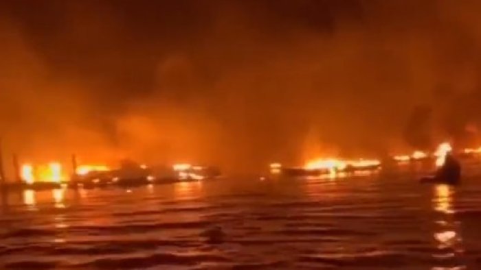 Yanğından və tüstüdən qaçan insanlar okeana üz tuturlar.