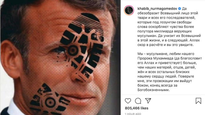 Dünya şöhrətli Həbib Nurməhəmmədov Fransa prezidenti Emmanuel Makronun şəklini üzündə ayaqqabı altının ləkəsi ilə paylaşaraq yazıb: