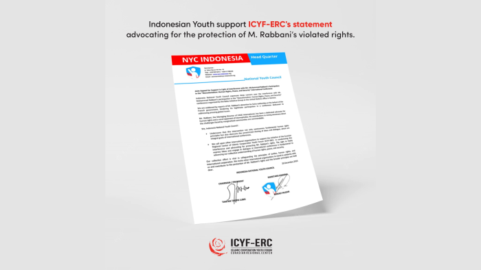 İndoneziyanın aparıcı gənclər təşkilatını özündə birləşdirən İndoneziya Milli Gənclər Şurası İslam Əməkdaşlıq Gənclər Forumu Avrasiya Regional Mərkəzinin (İƏGF Avrasiya Regional Mərkəzi) “CAGE” QHT-nin rəhbəri Məhəmməd Rəbbaninin Birləşmiş Millətlər Təşkilatının (BMT) Cenevrə ofisində Bakı Təşəbbüs Qrupu tərəfindən bu yaxınlarda təşkil olunmuş “Neokolonializm: İnsan Haqları, Sülh və Təhlükəsizlik” konfransına buraxılmamasını pisləyən bəyanatına dəstək olan bəyanatla çıxış edib.