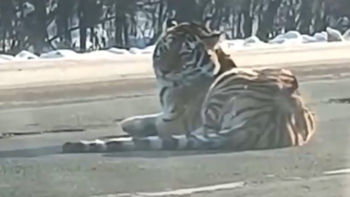 Bizim.Media xəbər verir ki, pələng magistral yola çıxaraq xeyli vaxt tərpənmədən orada uzanıb.