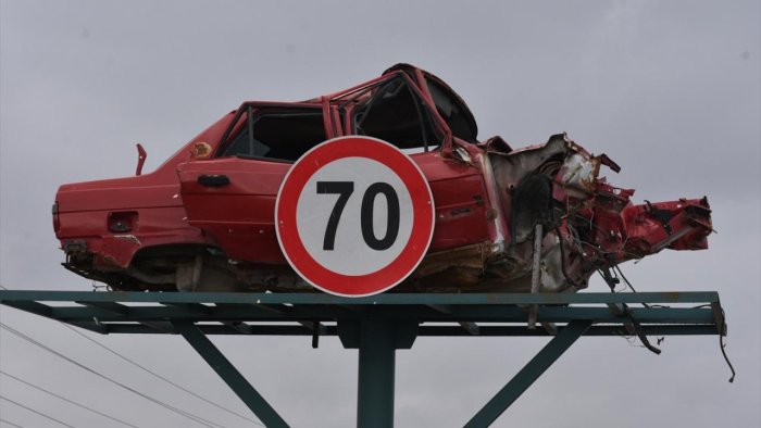 Bizim.Media xəbər verir ki, yol kənarında sürət tablolarının üzərinə qəzaya düşmüş avtomobillər yerləşdirilib.