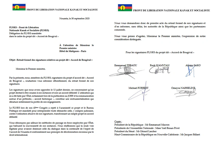 Məktubda Bujival razılaşmasını imzalayan FLNKS nümayəndələri 12 iyul 2025-ci ildə atdıqları imzaları rəsmi şəkildə geri çəkdiklərini qeyd edərək, həmin imzaların yalnız müzakirə üçün təqdim olunan layihəyə aid olduğunu və yekun xarakter daşımadığını vurğulayıblar.