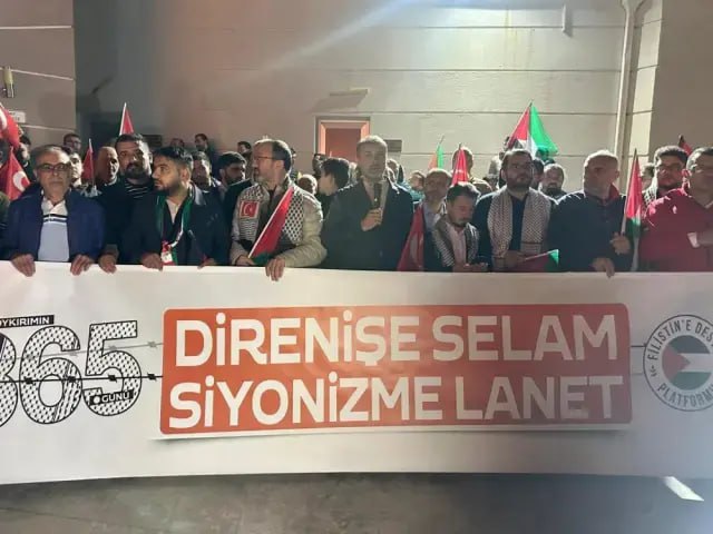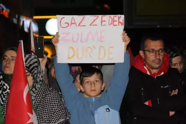 Etirazçılar əlində Türkiyə və Fələstin bayraqları ilə İsrailin Qəzzadakı hərəkətlərini “soyqırım” adlandıraraq fələstinlilərə dəstək ifadə ediblər.