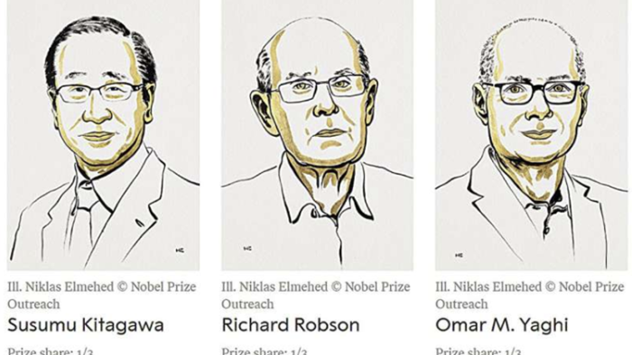 İsveç Elmlər Akademiyası kimya üzrə Nobel mükafatını Susumu Kitagava (Kyoto Universiteti, Yaponiya), Riçard Robson (Melburn Universiteti, Avstraliya) və Omar Yaği (Berklidəki Kaliforniya Universiteti, ABŞ) arasında bölüşdürüb.