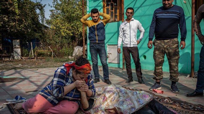 "Fuad İsmayılovun bacısı, erməni silahlı qüvvələrinin raket hücumu nəticəsində həmən həyatını itirən qardaşının əlini öpür".
