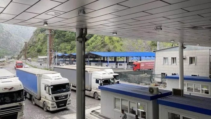 Ermənistanla Gürcüstan sərhədindəki nəzarət-buraxılış məntəqələrindən birində yük maşınlarının sürücüləri sərhədi xarici nömrə nişanlı yük maşınları üçün bağlayıblar.
