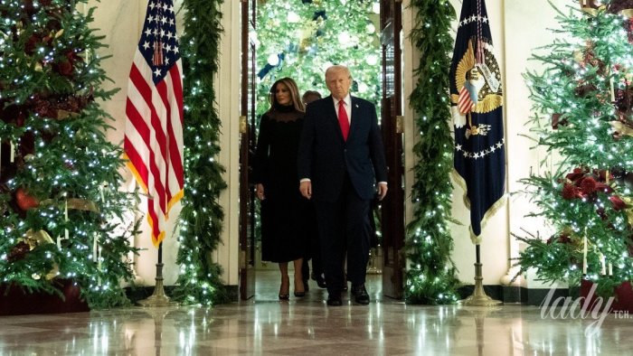 Melaniya Tramp zərif görünürdü. Donunda monoxromatik olsa da, yenə də bir unikal detal var idi - məşhur dəniz dibi dizaynında yaxalıqda torlu əlavə... Melaniya həmçinin donunu qara tuflilərlə qızılı tokalar, axşam makiyajı və özünəməxsus saç düzümü ilə uyğunlaşdırdı.