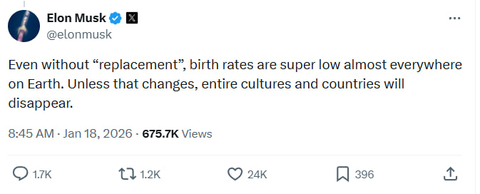 Onun sözlərinə görə, doğum nisbətlərinin qlobal azalması səbəbindən ölkələrin mövcudluğu təhlükə altındadır.