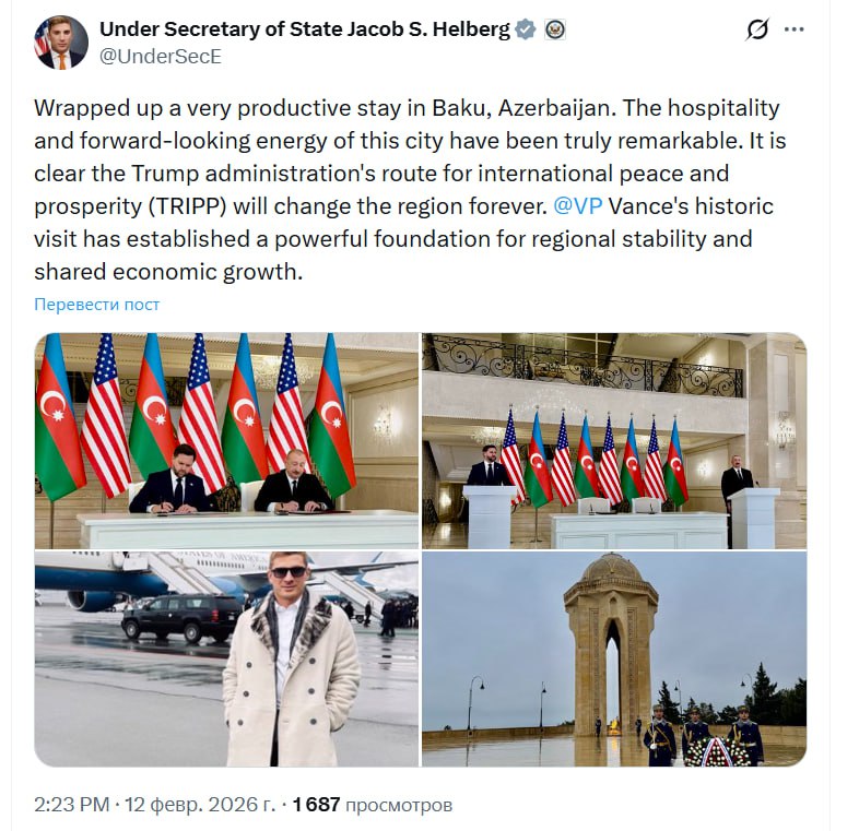 ABŞ-ın iqtisadi məsələlər üzrə dövlət katibinin müavini Ceykob Helberq bildirib ki, “Tramp marşrutu” Cənubi Qafqazı həmişəlik dəyişəcək.