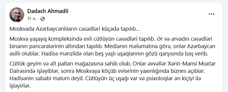 Bu barədə informasiyanı Dadaş Əhmədli adlı şəxs özünün Facebook səhifəsində paylaşıb.