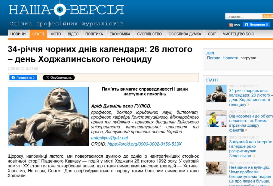 Ukraynanın “Naşa versiya” nəşrində “Azərbaycanlıların Xocalı soyqırımının 34-cü ildönümü: tarix nə deyir?” sərlövhəli məqalə dərc olunub.
