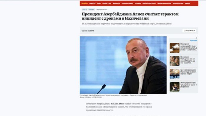 “Khabarpu.com” saytında dərc olunan materialda diqqətə çatdırılıb ki Azərbaycan Prezidenti ölkəsinin İrana qarşı əməliyyatlarda heç vaxt iştirak etmədiyini və etməyəcəyini bəyan edib. Bununla belə, dövlət başçısı martın 5-də İranın Azərbaycanın Naxçıvan bölgəsinə dronlar vasitəsilə hücumunu qətiyyətlə pisləyib, onu “terror aktı” adlandırıb və bu hadisəni törədənlərin məsuliyyətə cəlb olunmasını tələb edib.