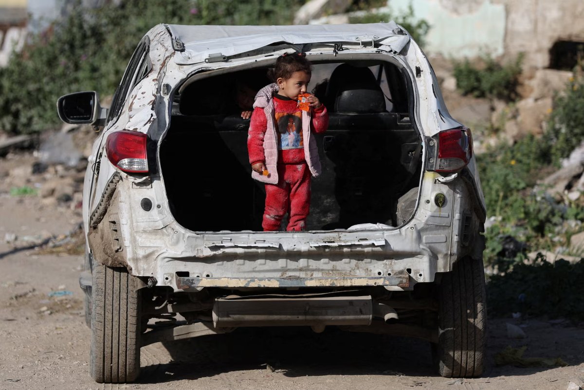 Qəzza (Fələstin). Fələstinli uşaq Fitr bayramı zamanı qəbiristanlıq yaxınlığında zədələnmiş avtomobilin yük yerində oturub.