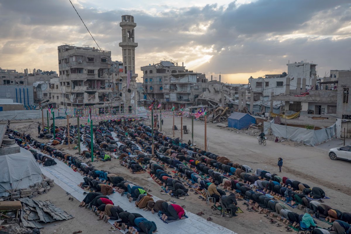Qəzza (Fələstin). Fələstinlilər dağıdılmış əl-Yərmuk məscidinin xarabalıqları arasında namaz qılırlar.