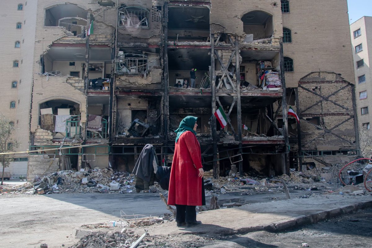 Tehran (İran). Qadın hava zərbəsi nəticəsində ziyan görmüş evinin qarşısında dayanıb.